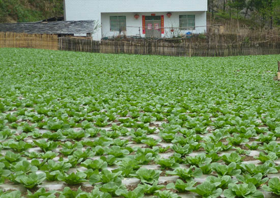碑口村四组村民胡兴发,一家三口人,为满足市场的需要,因地制宜,发展地膜蔬菜,增加家庭收入,2013年春季,一家种植地膜蔬菜15亩,计划在本年度家庭纯收入在2012年的基础上增加3.0万元。图为胡兴发栽植的地膜菜。