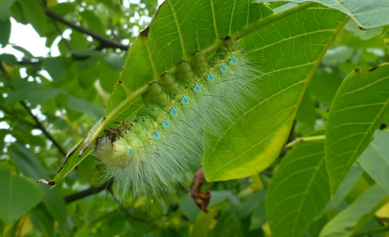 银杏大蚕蛾又名核桃大蚕蛾、白果蚕,俗称白毛虫。在本区域通常于5-6月进入幼虫为害盛期,常把树上叶片食光,而危害森林。2013516日,林场职工在常规巡山时发现了大面积的银杏大蚕蛾,主要分布在核桃树、梭罗树上,大面积蚕食树叶,危害森林。杨岔山林场拥有6130亩的核桃基地和1200亩梭罗树基地。虫害将严重危害基地的正常发展。